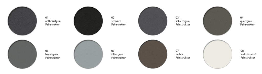 Řada VEKA Feinstruktur zahrnuje osm elegantních barevných variant: antracitově šedá, břidlicově šedá, čedičově šedá, umbra, černá, křemenně šedá, stříbřitě šedá a bílá. Tyto odstíny dokonale ladí s moderní architekturou a umožňují vytvořit stylová okna pro náročné klienty.
